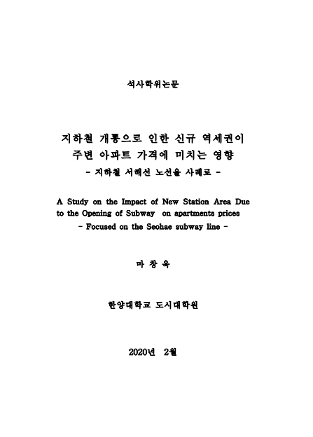 지하철 개통으로 인한 신규 역세권이 주변 아파트 가격에 미치는 영향 : 지하철 서해선 노선을 사례로 > thesis_master