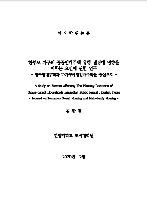 페이지 정보 본문 [한부모 가구의 공공임대주택 유형 결정에 영향을 미치는 요인에 관한 연구 : 영구임대주택과 다가구매입임대주택을 중심으로] 김한철(2020) 석사학위논문 관련링크 이전글 다음글 목록