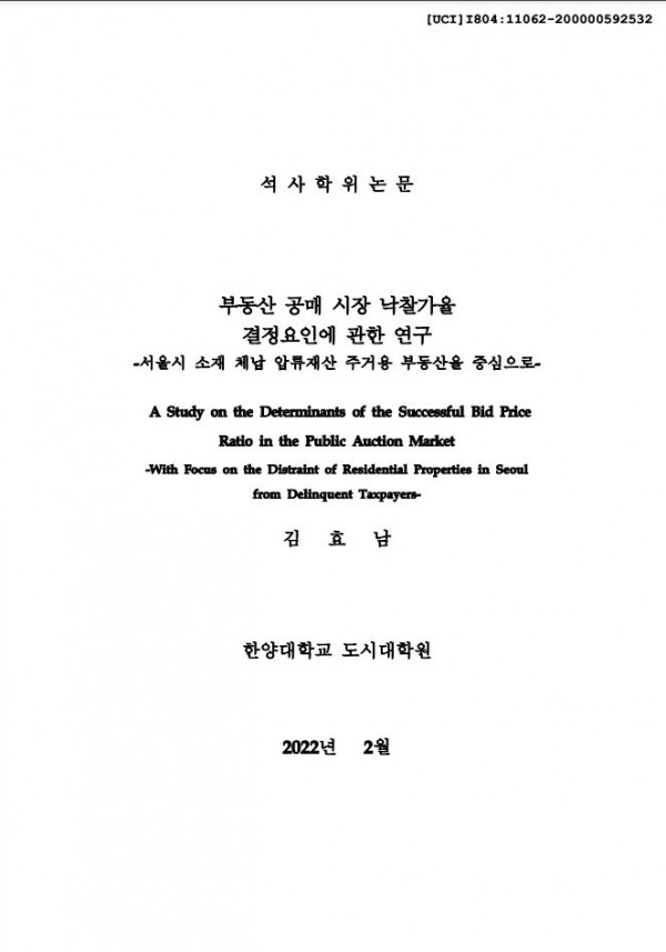 페이지 정보 본문 [부동산 공매 시장 낙찰가율 결정요인에 관한 연구 -서울시 소재 체납 압류재산 주거용 부동산을 중심으로-] 김효남(2022) 석사학위논문 관련링크 이전글 다음글 목록