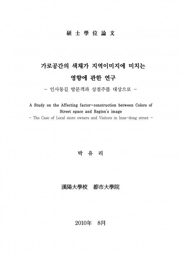 가로공간의 색채가 지역이미지에 미치는 영향에 관한 연구 - 인사동길 방문객과 상점주를 대상으로 > thesis_master