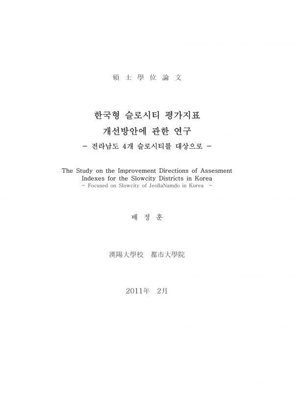 한국형 슬로시티 평가지표 개선방안에 관한 연구 전라남도 4개 슬로시티를 대상으로 > thesis_master