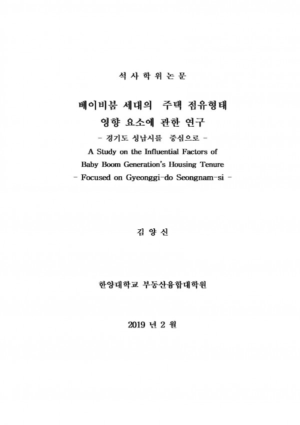 베이비붐 세대의 주택 점유형태 영향 요소에 관한 연구 :경기도 성남시를 중심으로 > thesis_master